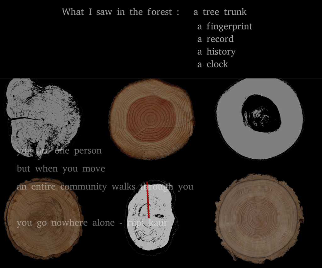 Our interactive rhythm and poetry performance centered around multiple tree trunk rings as clocks. Clicking on the tree trunks created a meditative sound world—sounding different rhythms, sonic textures generated from processing the rings on the trunks—while also surfacing text from our favorite poems which reflect on the connections between humans and nature.